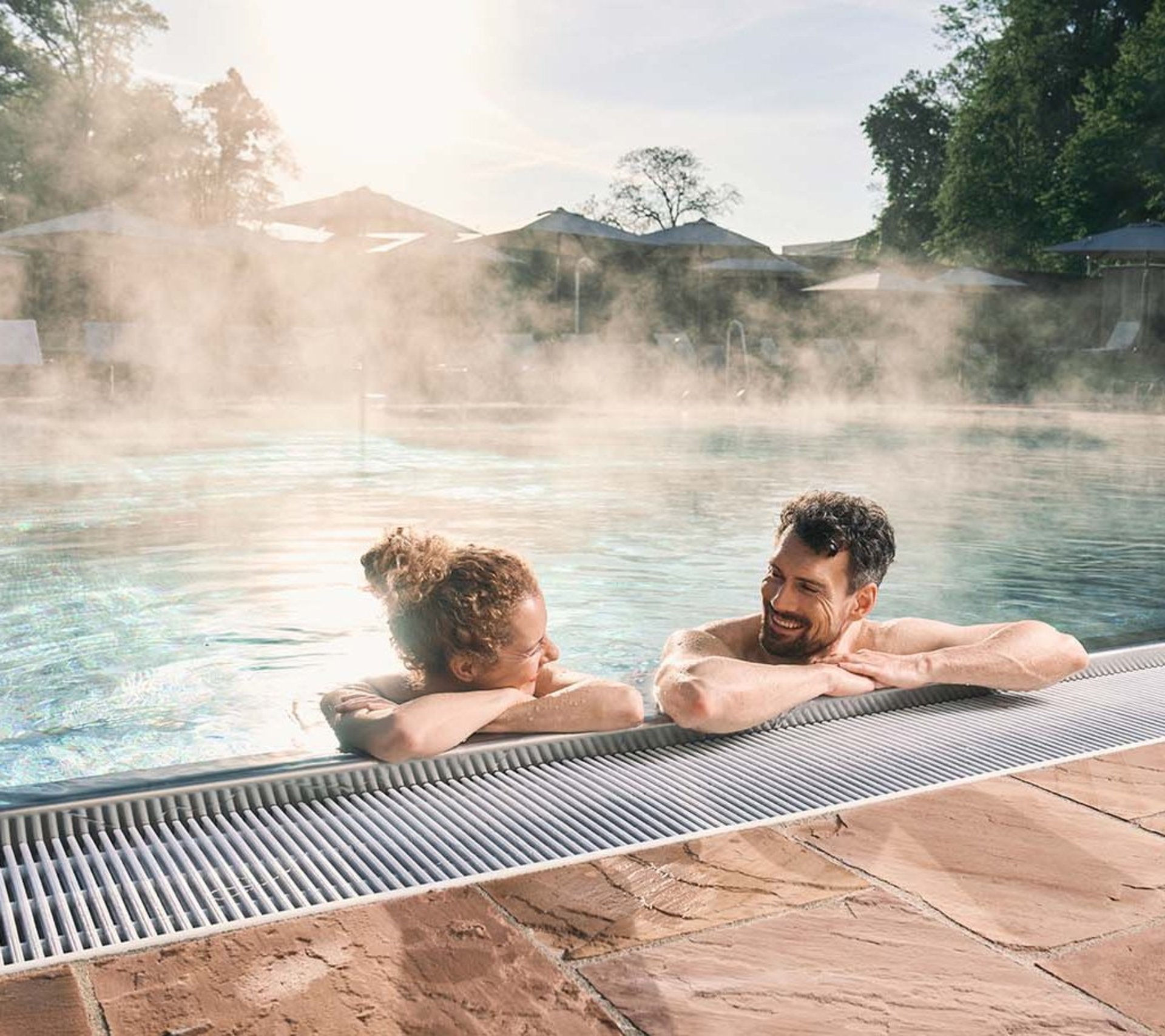 - Exklusiver, hoteleigener, parkseitig gelegener Wellnessbereich mit Saunen, Indoorpool und Ruheräumen