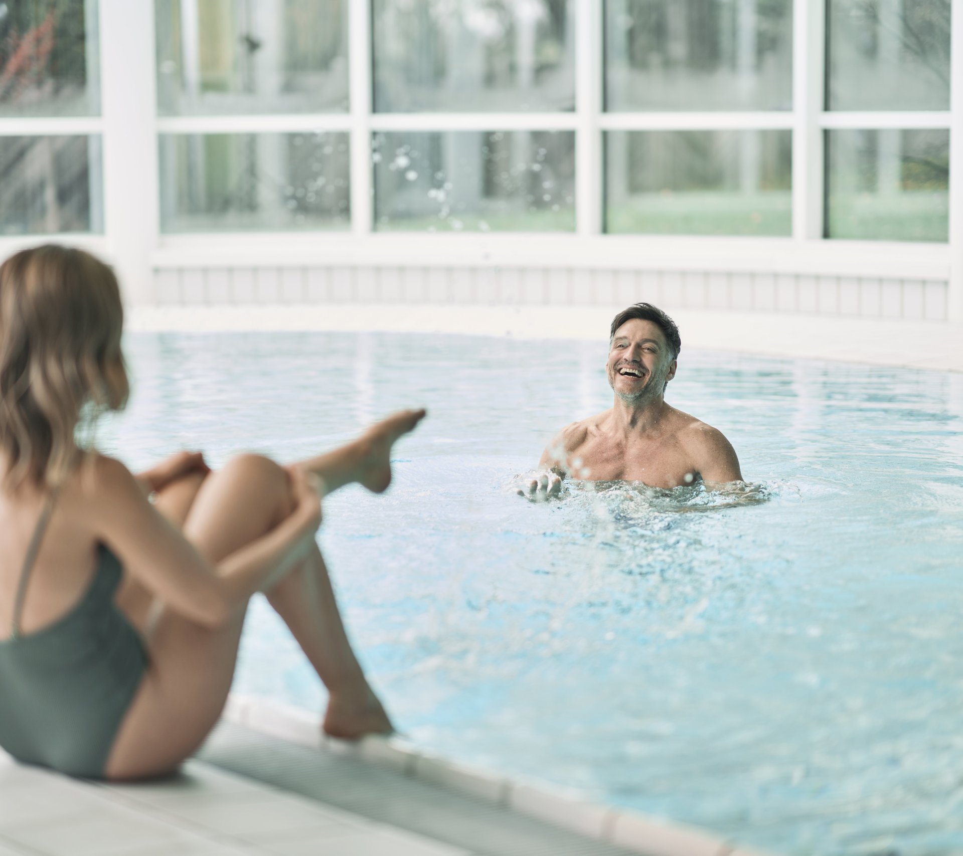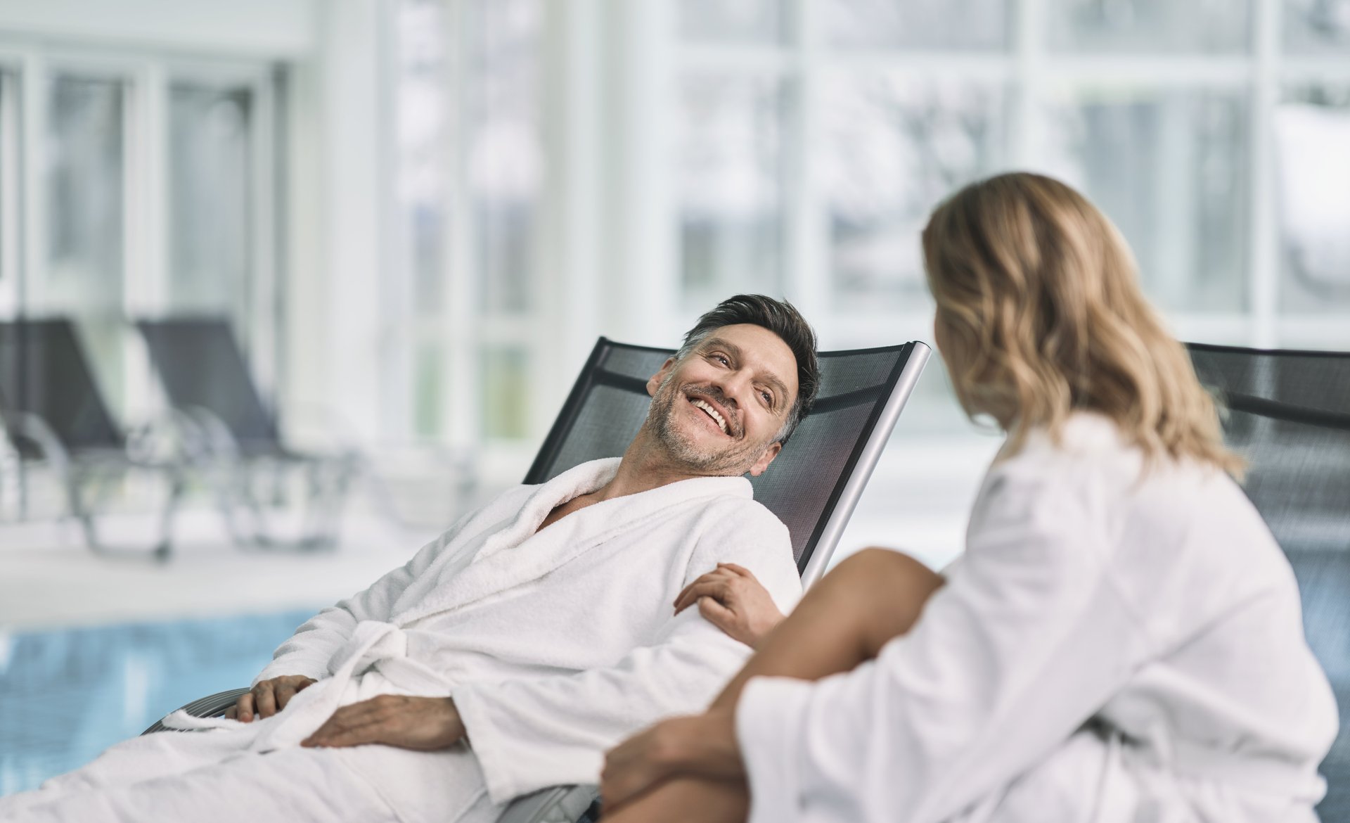 Die Relax-Oase im Hotel Miraverde****: modern und gemütlich gestaltet. Der richtige Ort, um Abstand zum stressigen Alltag zu gewinnen. Ob auf Kuschelliegen für zwei, unter dem schützenden Baldachin oder im ca. 32 °C warmen Thermalwasser des Innenbeckens. Beim Ausblick auf die bezaubernde Parklandschaft oder bei einer Ruhepause auf einer original Stressless-Liege im Wintergarten.