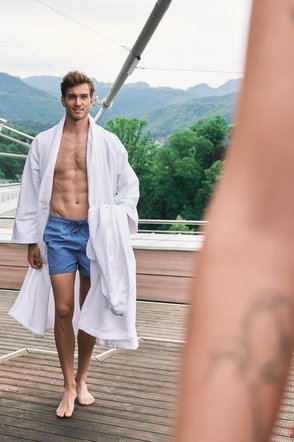 Wellnesstasche mit kuscheligem Bademantel und Badetüchern für die Dauer des Aufenthalts. Mit gutem Gewissen nachhaltig handeln - danke, dass Sie Ihre Badeschuhe selbst mitbringen