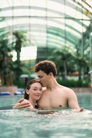Die Cabrio-Therme öffnet ihr Dach und unzählige Wege zur Entspannung. Wie eine Auszeit in der Ferne. Der ideale Ort, um den Kopf freizubekommen, loszulassen. Abzutauchen. Zwischen Thermal-Pools, Gesundheitspools und der Korallen-Grotte.