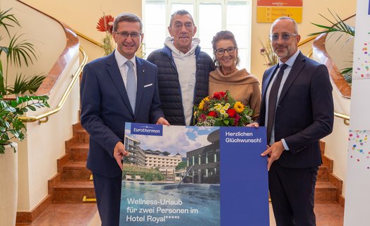 Kleine Auszeiten, Urlaub vom Alltag sind wichtiger denn je. Besonders gut gelingt dieses „Abschalten“ in einer Therme mit angenehmer Atmosphäre. Die Wellness-Profis der Eurothermen erfahren daher auch in diesem Jahr regen Zulauf. Claudia und Josef aus Bad Ischl sind die 1-Millionsten Thermengäste 2024 und wurden in der Eurotherme Bad Ischl mit einem Urlaubs-Gutschein und einem Blumenstrauß überrascht. Wirtschafts- und Tourismuslandesrat Markus Achleitner und Eurothermen-Geschäftsführer Mag. Patrick Hochhauser gratulierten persönlich.